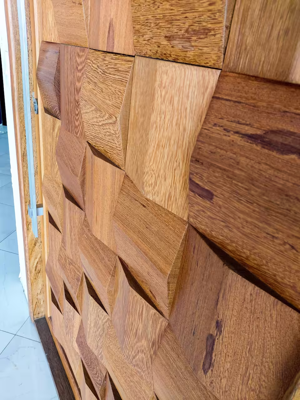 Ideal para quem busca fugir do comum, este modelo une o rústico da madeira natural à elegância dos padrões geométricos contemporâneos. O sistema pivotante completa o conjunto, garantindo uma abertura leve e fluida, mesmo sendo uma porta sólida e imponente.