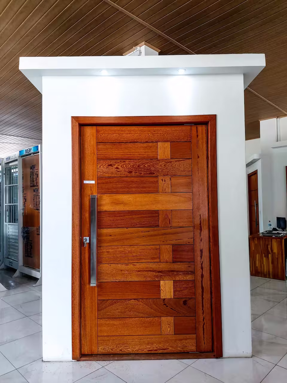 A Porta Pivotante em Angelim PSM 1423 é perfeita para quem busca uma entrada imponente com detalhes exclusivos. Fabricada em madeira Angelim maciça, ela se destaca pela alta resistência e pelo tom natural elegante. O design 1423 utiliza frisos precisos que conferem profundidade à folha, tornando a porta uma peça central na arquitetura da casa. Por ser totalmente sólida, garante isolamento acústico superior e total privacidade.